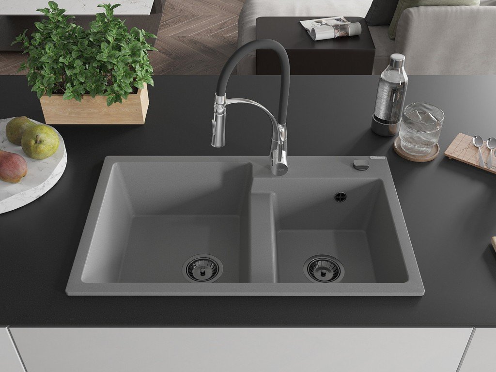 MEXEN/S - Tomas granitový dřez 2-bowl včetně baterie Aster, šedá 6516-71-73450-07-B