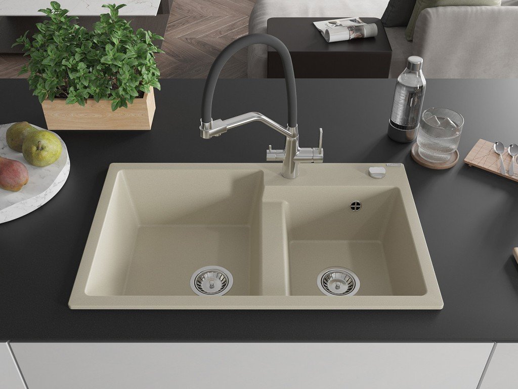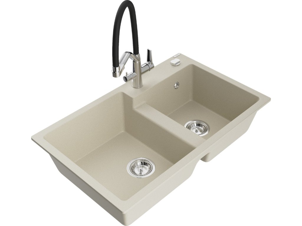 MEXEN/S - Tomas granitový dřez 2-bowly včetně baterie Duo, béžová 6516-69-671701-07