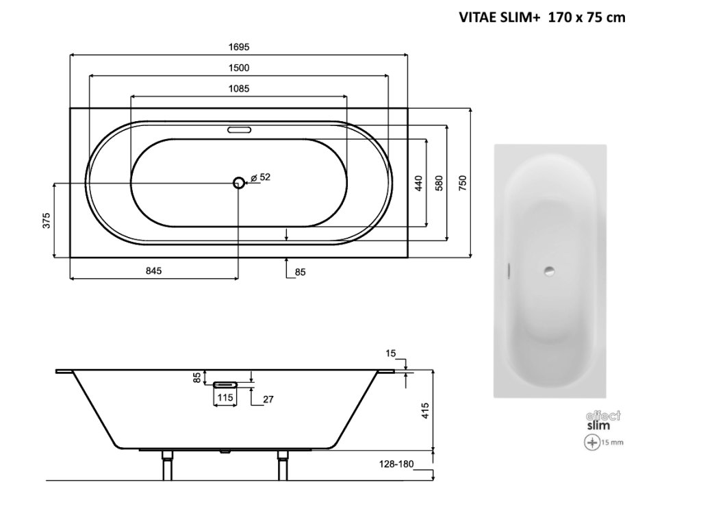 Obdélníková vana VITAE SLIM+, S nožičkami, 170 × 75 cm + slevový kód