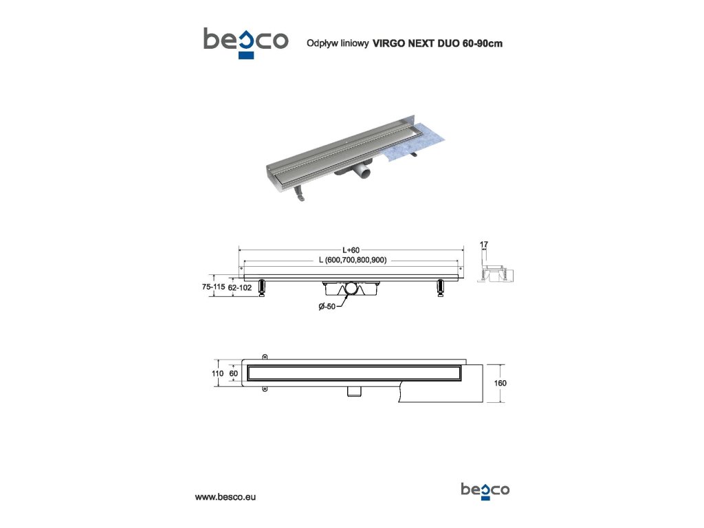 Odtokový žlab VIRGO NEXT DUO- 60: délka roštu 60 cm, délka žlabu 66 cm
