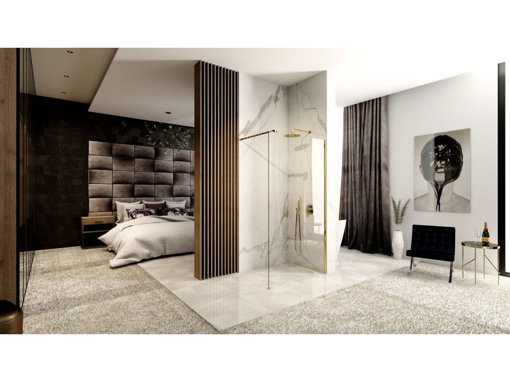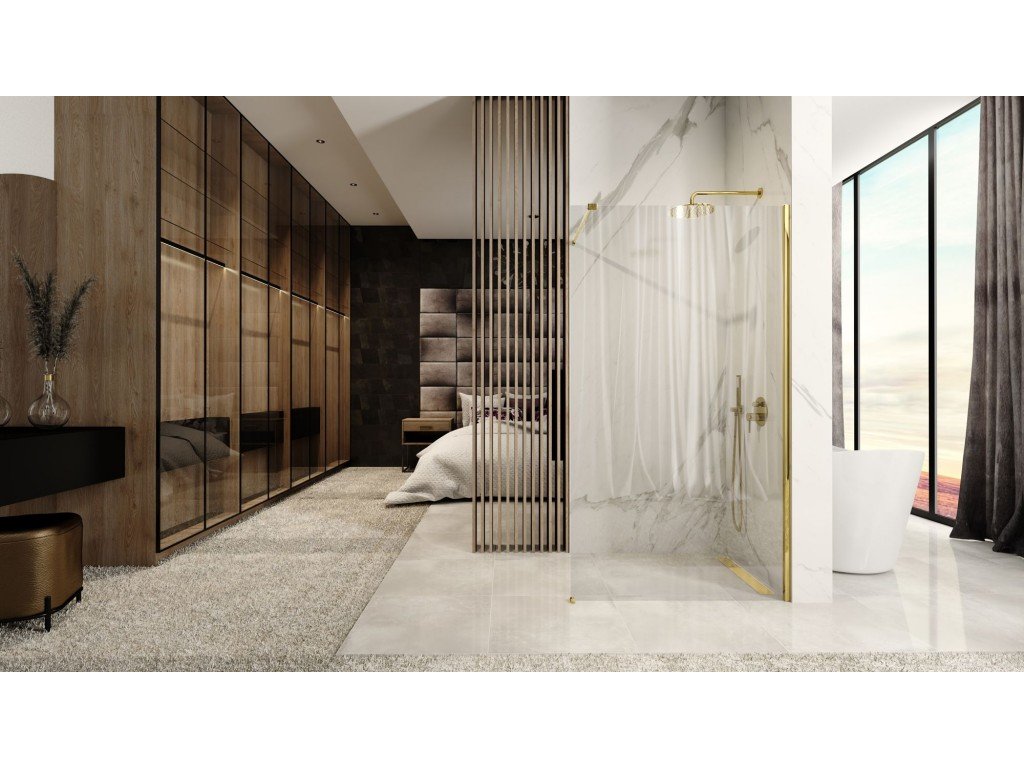 Moderní sprchová walk-in zástěna Rea Aero se zlatými profily dokonale vyplní váš prostor v koupelně při zachování dokonalého vzhledu a estetiky interiéru. Instalace je možná jak na sprchovou vaničku, tak přímo na podlahu. Byla vyrobena z vysoce kvalitního tvrzeného skla. Její zlaté prvky byly laserem potaženy čtyřnásobným povlakem ze smaltu nejvyšší kvality.
