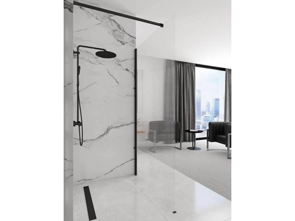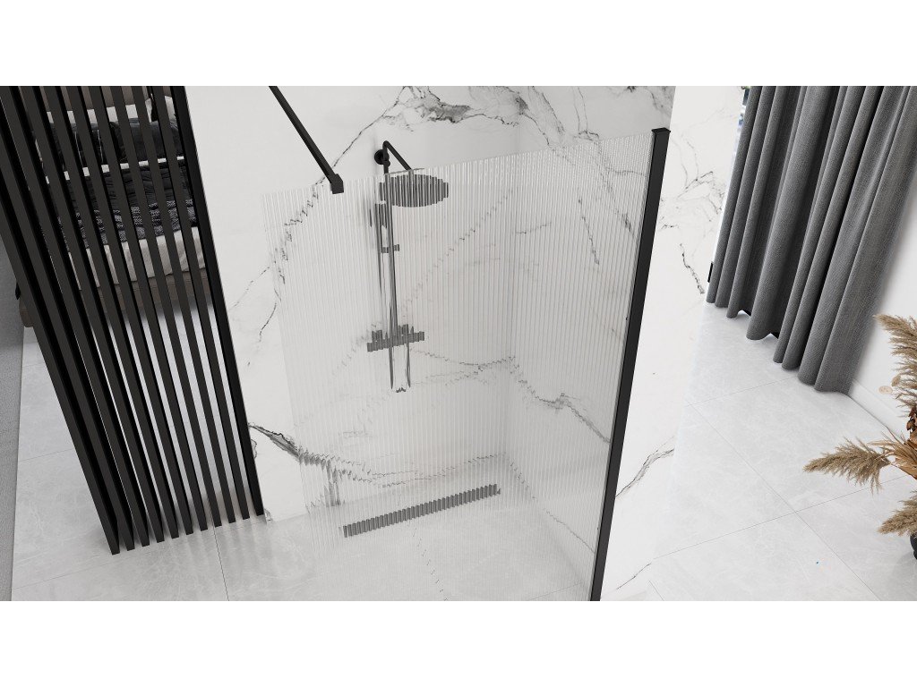 Představujeme vám krásnou a mimořádně funkční a moderní sprchovou stěnu. Jedná se o výrobek, který dokonale vyplní prostor vaší koupelny při zachování dokonalého vzhledu a estetiky interiéru. Stěna je vhodná pro montáž na sprchovou vaničku nebo s lineárním odtokem. Byl vyroben z kvalitního průhledného rýhovaného skla. Drážkování je efekt získaný hlubšími a pravidelnými drážkami, připomínajícími svislé jemné pruhy. Vroubkované sklo vnáší do místnosti dynamiku a útulnou, intimní atmosféru. Černé prvky byly 4krát potaženy laserem nejkvalitnějším smaltem. Díky této technice jsou hliníkové prvky skla chráněny proti korozi, matování a změně barvy. CAD instrukce