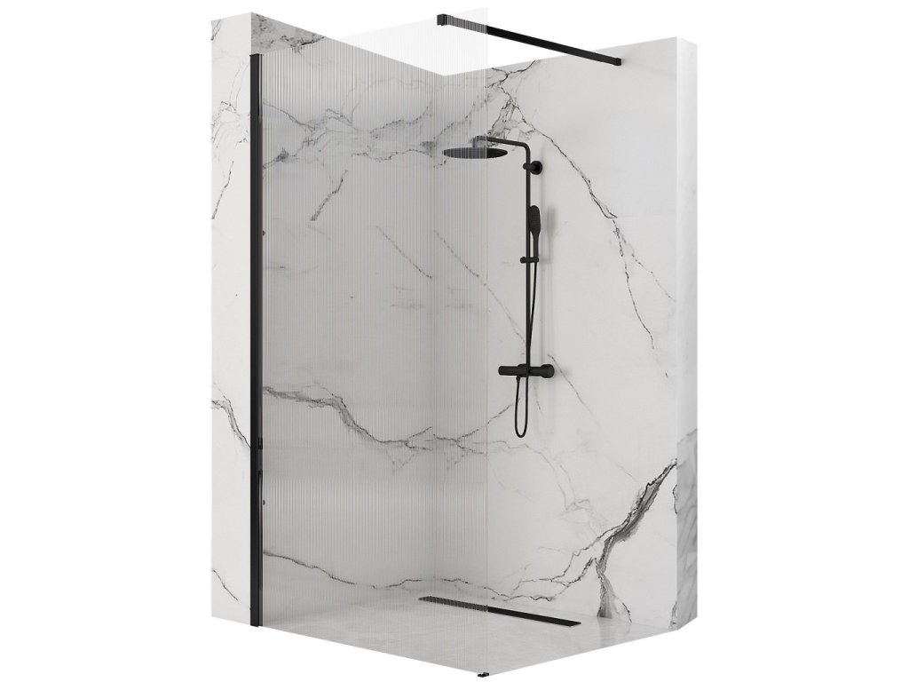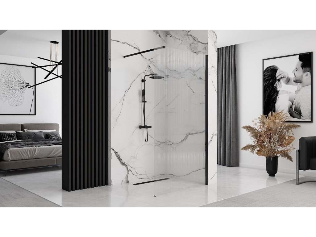Představujeme vám krásnou a mimořádně funkční a moderní sprchovou stěnu. Jedná se o výrobek, který dokonale vyplní prostor vaší koupelny při zachování dokonalého vzhledu a estetiky interiéru. Stěna je vhodná pro montáž na sprchovou vaničku nebo s lineárním odtokem. Byl vyroben z kvalitního průhledného rýhovaného skla. Drážkování je efekt získaný hlubšími a pravidelnými drážkami, připomínajícími svislé jemné pruhy. Vroubkované sklo vnáší do místnosti dynamiku a útulnou, intimní atmosféru. Černé prvky byly 4krát potaženy laserem nejkvalitnějším smaltem. Díky této technice jsou hliníkové prvky skla chráněny proti korozi, matování a změně barvy. CAD instrukce