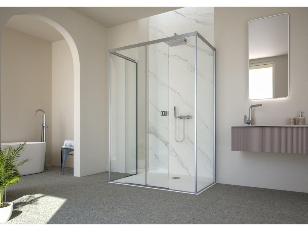 Posuvné skleněné stěny řeší atypické vstupy v prostorných koupelnách. Vytváří velmi luxusní dojem, který je podpořen výrazným madlem. Dveře se dodávají v levém nebo pravém provedení. Bezpečnostní sklo je opatřeno povrchovou úpravou AQUA CLEAN pro jednodušší údržbu.