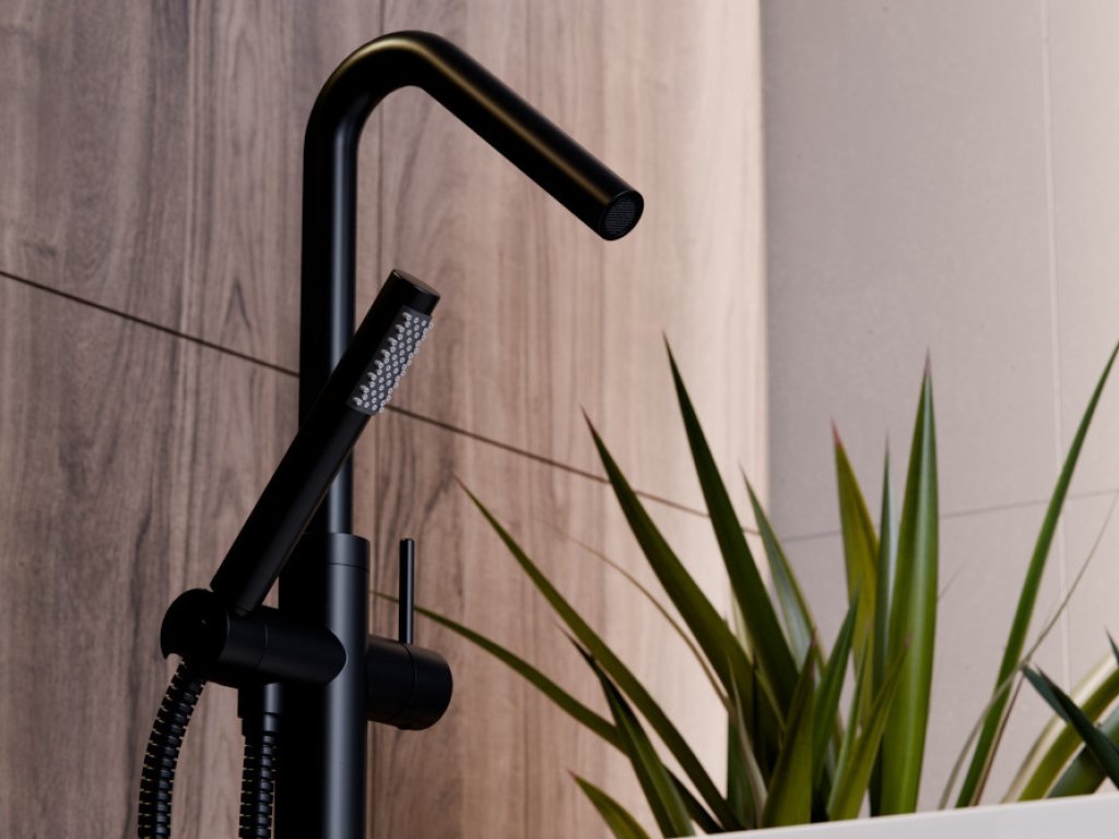 Stojánková baterie do podlahy vypadá skvěle v kombinaci s volně stojící vanou.