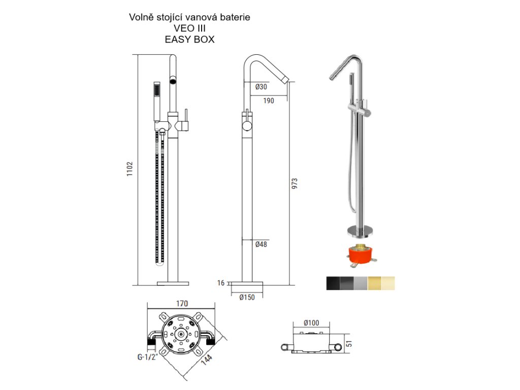 Vanová stojánková baterie je dodávána včetně příslušenství (instalačního box pro snazší instalaci, sprchová růžice a hadice). Dodáváme v pěti barvách a to chrom, černá, grafitová nebo zlatá, zlatá lesklá, zlatá broušená.