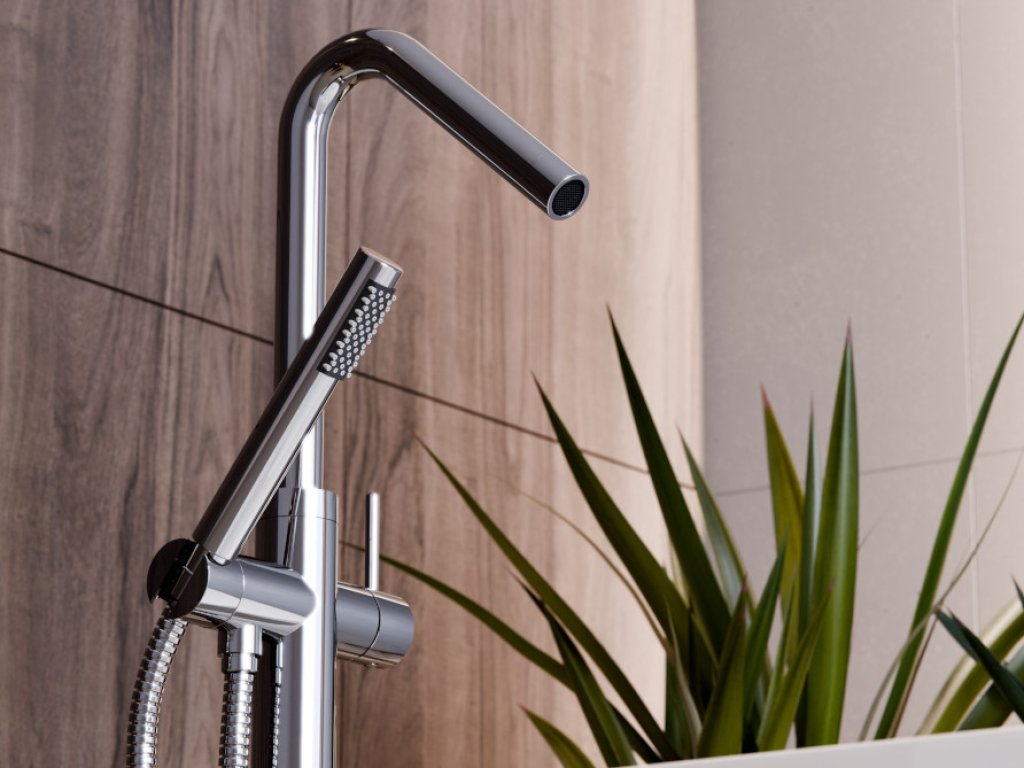 Stojánková baterie do podlahy vypadá skvěle v kombinaci s volně stojící vanou.