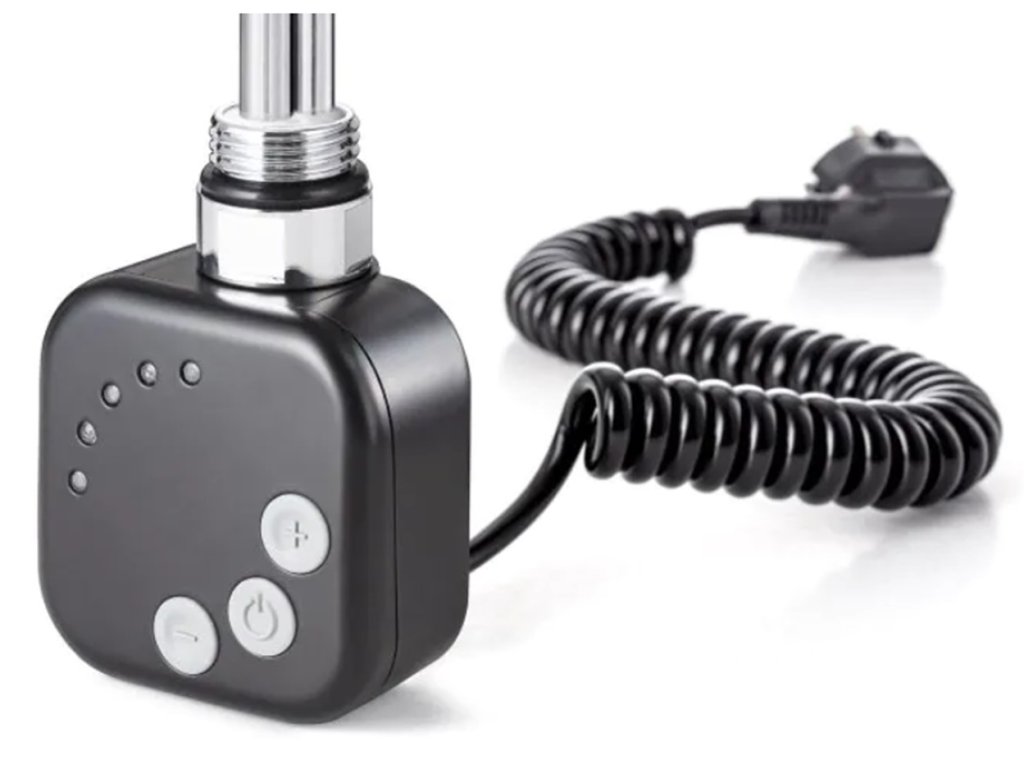 Elektrický sušák ručníků PRIMAVERA do moderního interiéru s hloubkou pouze 10 cm - v bílé a černé barvě jsou nejen trubky a uchycení, ale i napájecí kabel a elektrická zástrčka....