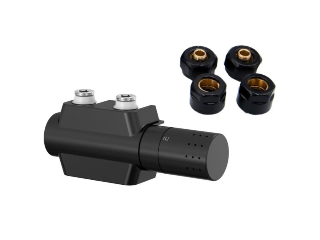 Rohová oboustranná (levá i pravá) termostatická sada INTEGRATO vč. 2 krycích rozet a 2 krycích trubiček (mosaz) je určena pro připojení radiátorů na rozvody TUV s vývodem ze zdi...