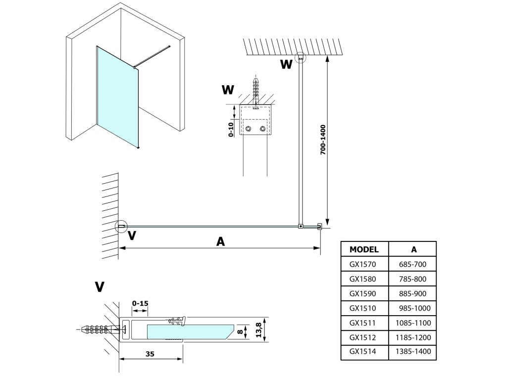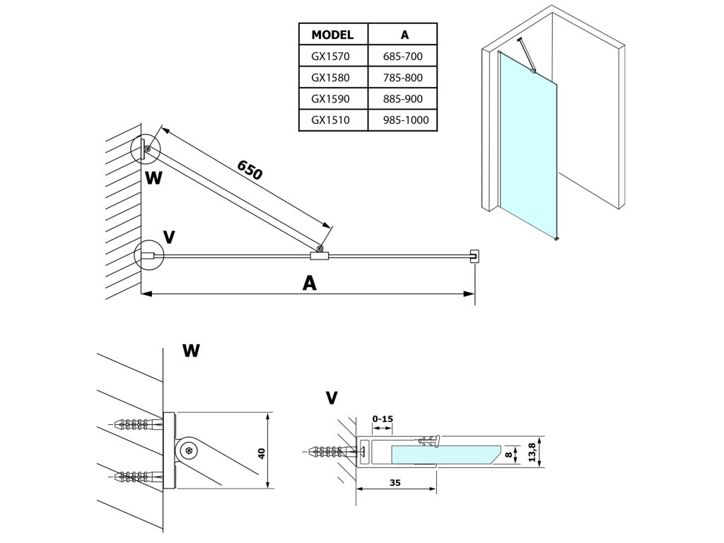 - Stěnové profily s tolerancí 15 mm usnadňují stabilní montáž zástěn, instalace je možná na dlažbu nebo sprchovou vaničku